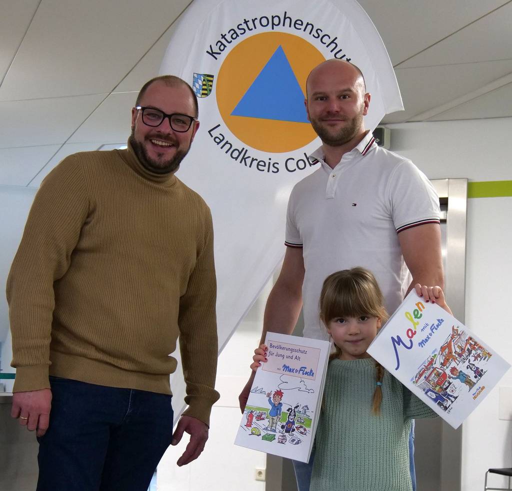 Bild: Einmal Max und „Flocke“, bitte: Ellie hat sich bei Landrat Sebastian Straubel (links) und Patrice Kolb die beiden kostenlosen Hefte des Bundesamtes für Bevölkerungsschutz und Katastrophenhilfe abgeholt.