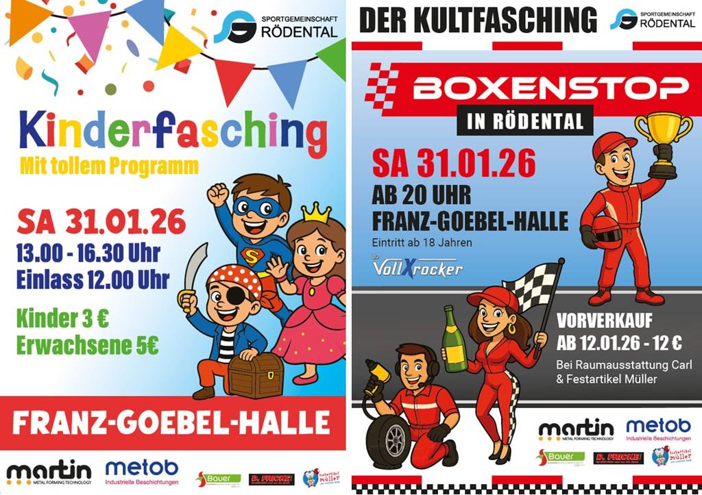 Der Kinderfasching der SG Rödental geht von 13:00 bis 16:30 Uhr mit tollem Programm in die nächste Runde! Einlass ist bereits ab 12:00 Uhr.