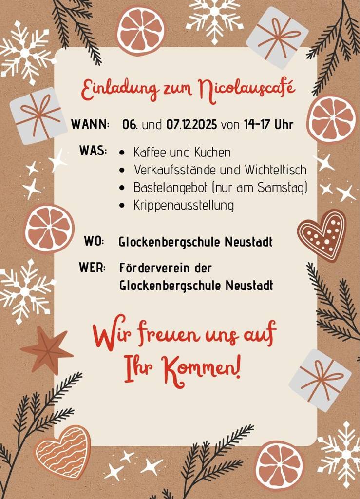 Herzliche Einladung zu unserem diesjährigen Nikolauscafé am 06.12. und 07.12.2025 von 14:00 bis 17:00 Uhr in der Glockenbergschule Neustadt bei Coburg.