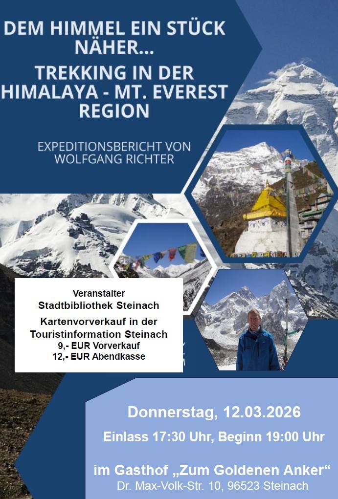Wolfgang Richter lädt Sie zu einem unvergesslichen Expeditionsbericht ein, der Sie auf die legendäre Trekking-Route zum Everest-Base-Camp (5.380 m) und Khala Pattar (5.550 m) mitnimmt. Erleben Sie die beeindruckende Bergwelt und hören Sie fesselnde Berichte über die Herausforderungen und Schönheiten dieser Reise. Lassen Sie sich von den atemberaubenden Bildern und der Leidenschaft für das Trekking inspirieren. Ein Abend voller Geschichten und Abenteuer erwartet Sie!