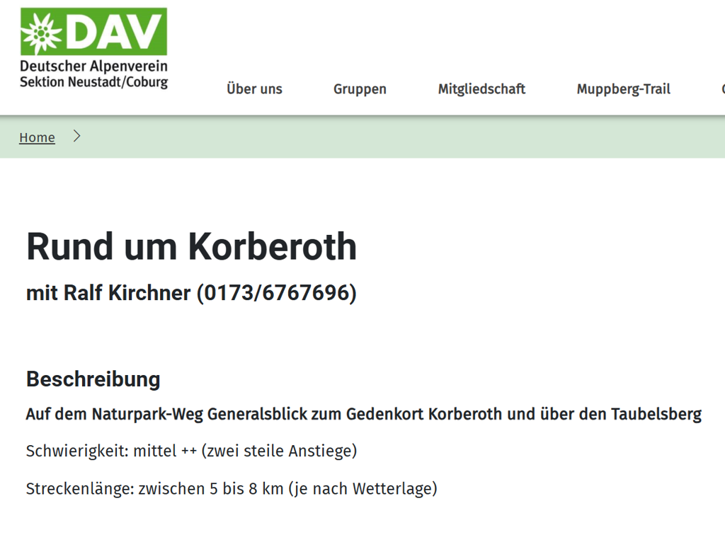 Die Sektion Neustadt bei Coburg des DAV bietet am Sonntag, 2. November 2025 unter der Leitung von Naturpark- und Höhlenführer Ralf Kirchner eine mittelschwere Wanderung auf dem Naturpark-Weg Generalsblick zum Gedenkort Korberoth und über den Taubelsberg an. Die Strecke mit zwei steilen Anstiegen ist je nach Wetterlage 5 oder 8 km lang. Verpflegung aus dem Rucksack.