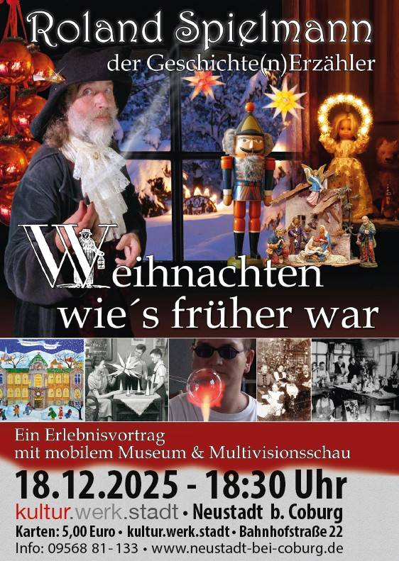 Der Vortrag ist eine Form erlebter Heimatkunde für Erwachsene und nimmt das Publikum mit in eine längst vergangene Zeit. Illustriert wird der Abend durch Exponate aus seinem mobilen Museum abgerundet durch Bilder und Filmsequenzen. Freuen Sie sich auf einen unterhaltsamen, interessanten Vortrag und weihnachtliche Leckereien!