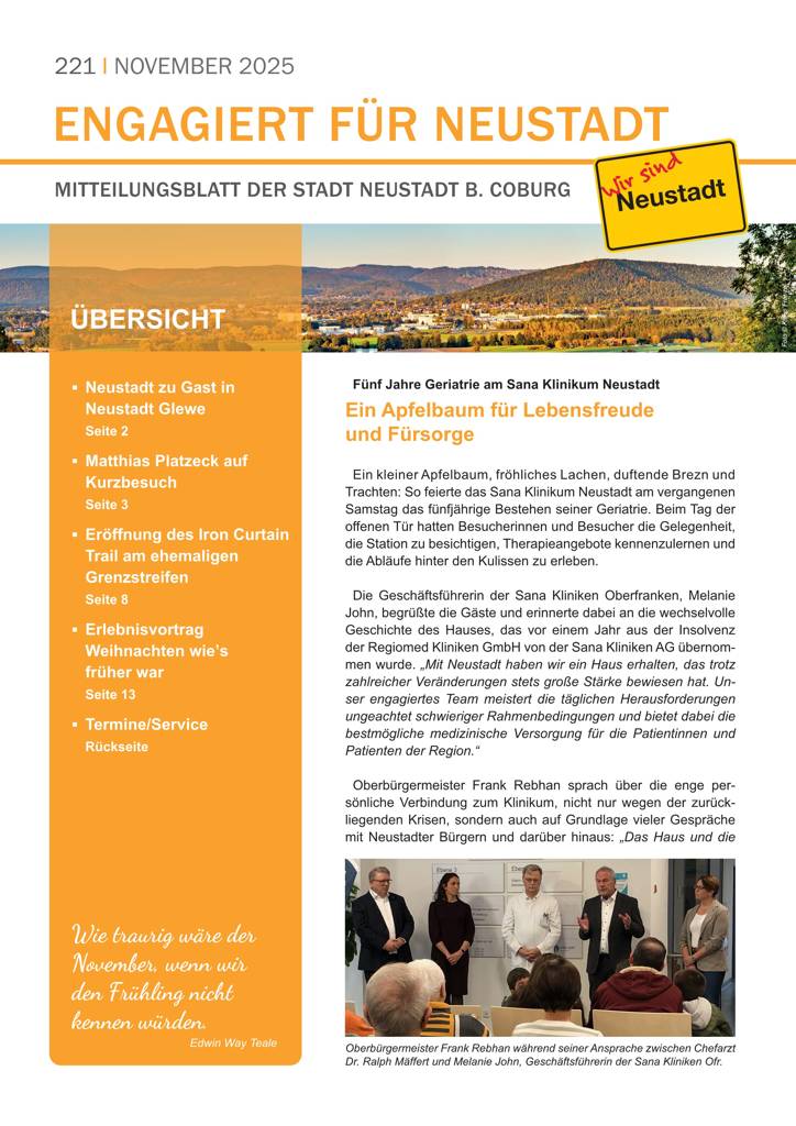 Hier stellen wir Ihnen das Mitteilungsblatt „Engagiert für Neustadt" der Stadt Neustadt b. Coburg monatsaktuell als Download zur Verfügung.