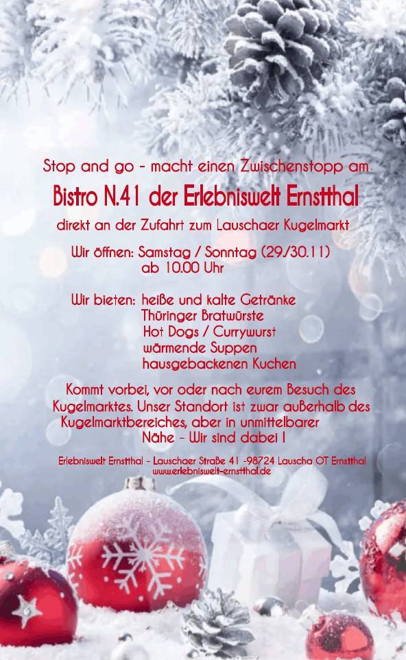 Machen Sie doch einen Zwischenstopp am Bistro N.41 der Erlebniswelt Ernstthal direkt an der Zufahrt zum Lauschaer Kugelmarkt!