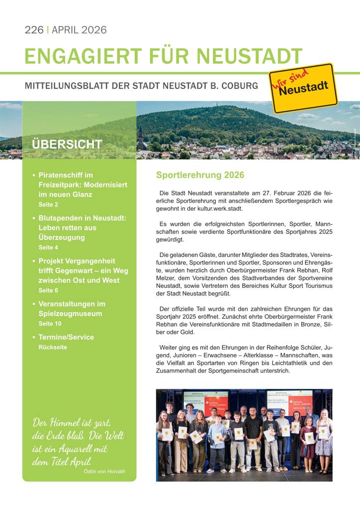 Hier stellen wir Ihnen das Mitteilungsblatt „Engagiert für Neustadt" der Stadt Neustadt b. Coburg monatsaktuell als Download zur Verfügung.