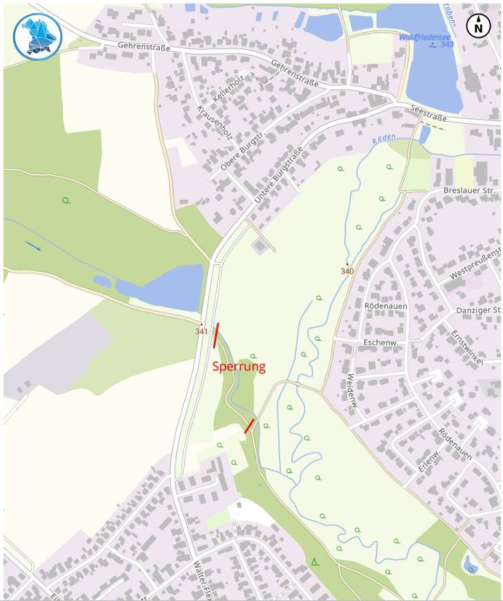 Bis auf Weiteres muss der Waldweg am Rottenbach in Richtung Rödenauen vollständig gesperrt werden. Eine routinemäßige Begehung hat ergeben, dass entlang des Weges Äste abgestorben sind. Ganze Bäume drohen insbesondere bei Wind und Niederschlag umzustürzen.
