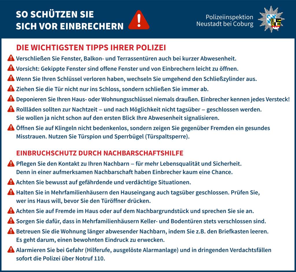 Nachdem sich vor allem auf sozialen Plattformen die Gerüchte über eine vorgebliche Einbruchserie mehren, gibt die Polizeidirektion Neustadt bekannt: Im ganzen Landkreis Coburg ist ein normaler Anstieg der Einbruchsdelikte in der Kriminalstatistik zu verzeichnen, daher kann von einer Einbruchserie keine Rede sein. In den Wintermonaten, ("dunkle Jahreszeit"), erhöhen sich die Einbruchszahlen tendenziell.