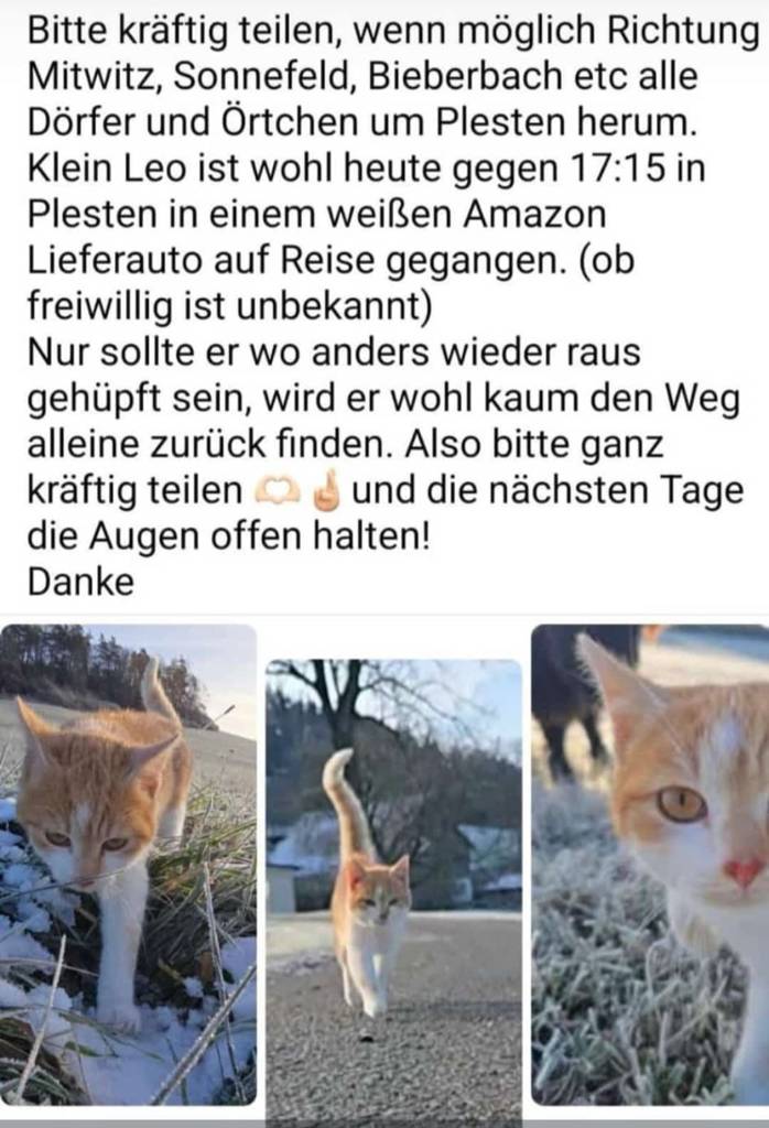 Leo ist gestern in einem weißen Amazon-Lieferwagen verschwunden. Falls der kleine Kater unterwegs wieder herausgehüpft sein sollte, könnte er sich eventuell Richtung Mitwitz, Sonnefeld, Bieberbach und in allen Örtchen rund um Plesten befinden. Wer ihn sichtet, möchte sich bitte beim Tierschutzverein unter der Telefonnummer 09568 859566 melden.