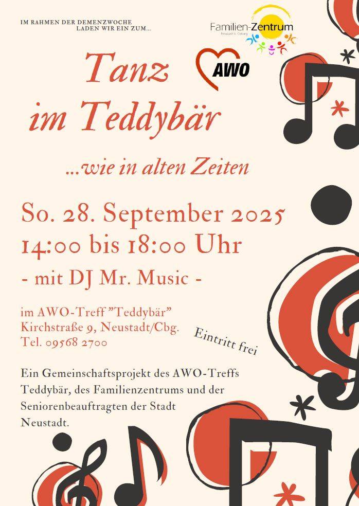 Mit einem Gemeinschaftsprojekt des AWO-Treffs Teddybär, dem Familienzentrum und der Seniorenbeauftragten der Stadt Neustadt soll im Rahmen der Bayerischen Demenzwoche vom 19. – 28.09.2025 auch in Neustadt auf die Erkrankung aufmerksam gemacht werden.