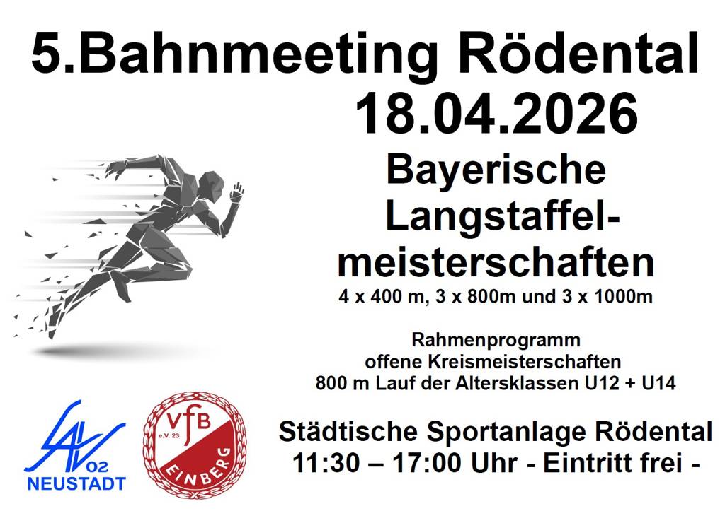 Am 18.04.2026 haben der LAV02 Neustadt und der VfB Einberg im Rahmen des Bahnmeetings Rödental den Zuspruch für die Bayerischen Langstaffelmeisterschaften erhalten. Hier werden in allen Altersklassen ab U16 bis zu den Senioren die Bayerischen Meister über 4 x 400 m sowie 3 x 800 m bzw. 3 x1000 m gesucht.