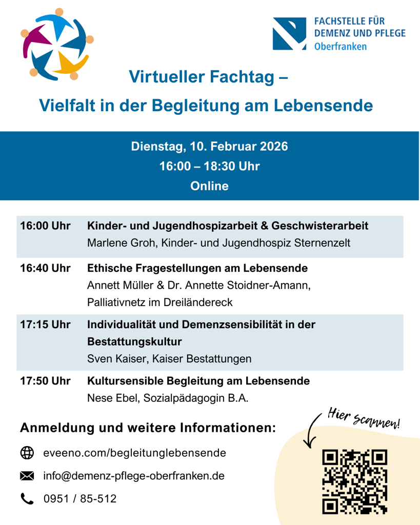 Die Fachstelle für Demenz und Pflege Oberfranken lädt zu einem kostenfreien Online-Fachtag zum Thema „Vielfalt in der Begleitung am Lebensende“ ein. Dieser findet am Dienstag, 10. Februar 2026 von 16:00 bis 18:30 Uhr über Microsoft Teams statt. Der Fachtag richtet sich an Angehörige, ehrenamtlich und professionell Tätige und alle Interessierten. Ziel ist es, für die unterschiedlichen Bedürfnisse von Menschen am und um das Lebensende herum zu sensibilisieren und Wissen zu einer würdevollen Begleitung zu vermitteln.