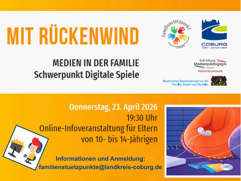 Die Teilnahme an der Informationsveranstaltung ist über die Plattform „BigBlueButton“ möglich. Weitere Informationen sowie die Möglichkeit zur Anmeldung (letzter Tag: Do., 16. April) gibt es per E-Mail an die Koordinierungsstelle Familienbildung und Familienstützpunkte am Landratsamt: familienstuetzpunkte@landkreis-coburg.de